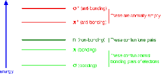 Diagram berikut memberikan gambaran umum bagaimana energi dari berbagai jenis orbital saling berhubungan satu sama lain dalam beberapa senyawa. Kita akan melihatnya untuk menerangkan penyerapan cahaya. Diagram ini hanya menunjukan skala relatif.